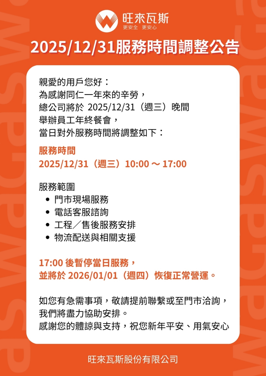 12/31 服務時間調整公告